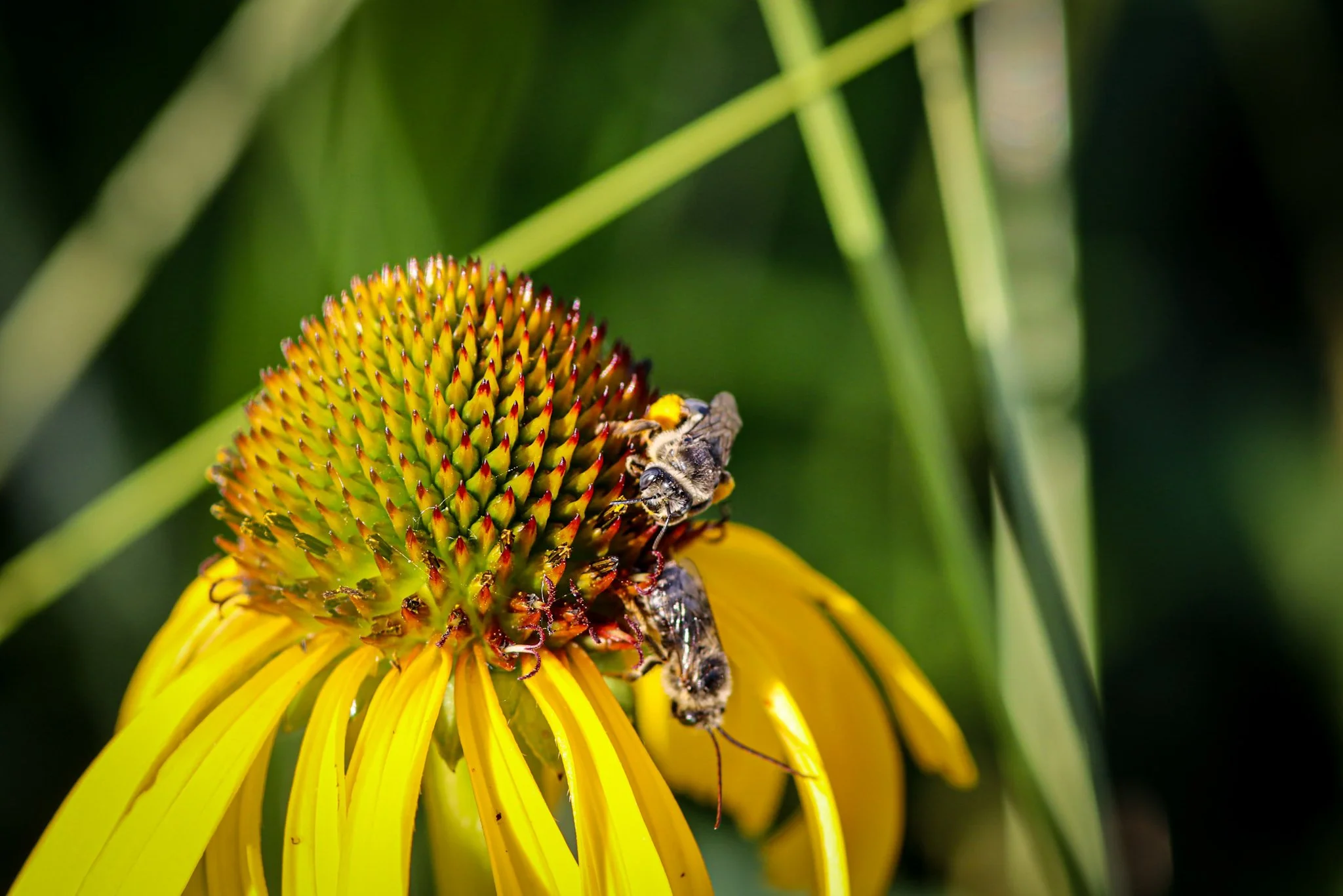 Nectar of Bush’s Coneflower accumulates in a cup formed by the fused bases of the filaments and remains available through the fourth day of the flower’s life. Female-phase florets that are adjacent to pollen-rich male-phase florets produce additional nectar. When bees visit these female florets to collect nectar, they are likely to pick up pollen from the nearby male florets and then transfer that pollen to the next Bush’s Coneflower they visit. The structure of the flower head guides the movement of visitors in a way that promotes cross-pollination between Bush’s Coneflowers.