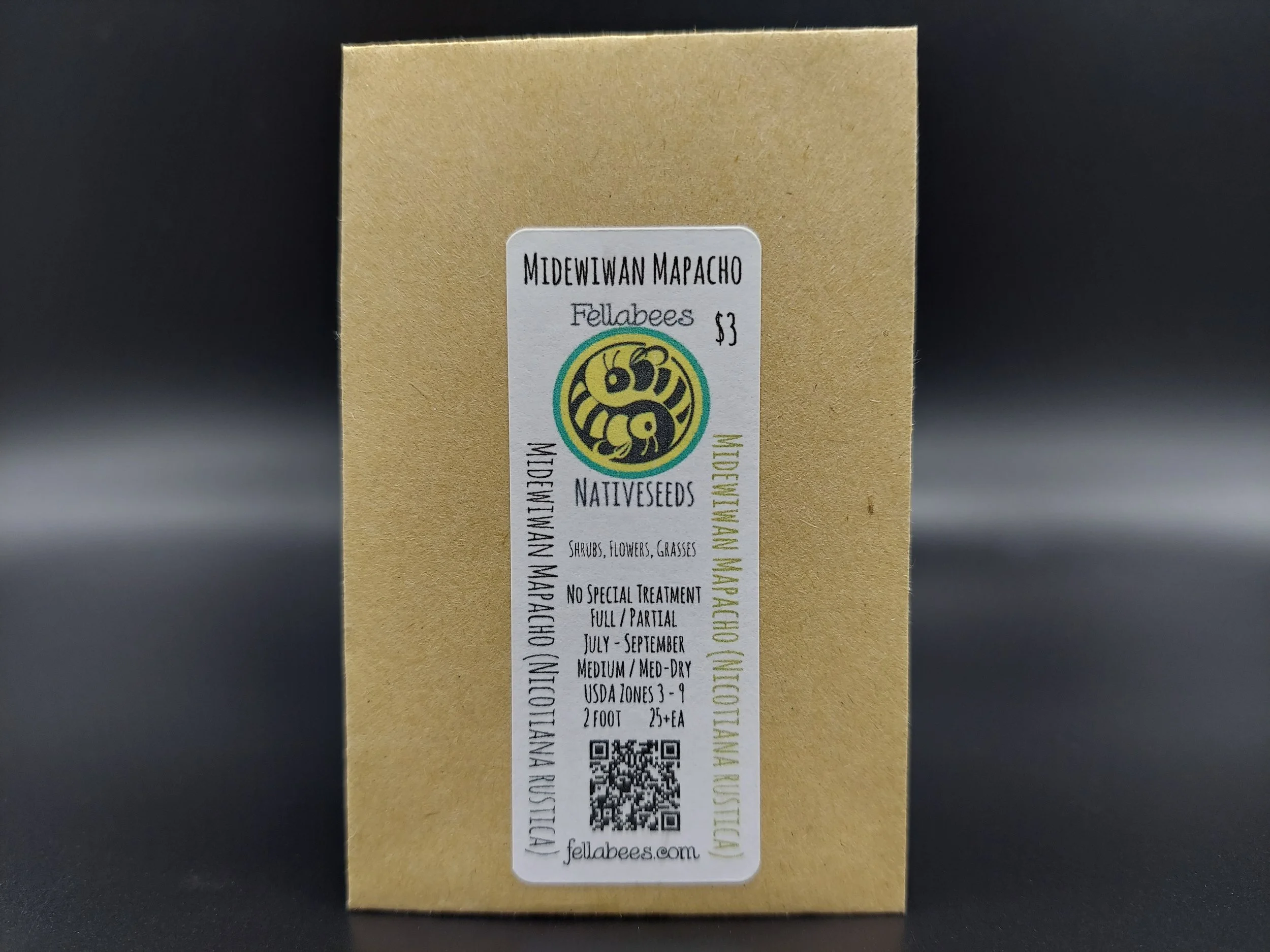 Nicotiana rustica is the scientific name for the plant commonly known as Midewiwan Mapacho, Sacred Tobacco, Aztec Tobacco, or Shamanic Tobacco. It is an annual that is not tolerant of shade but can grow in any well drained soil from clay to loam to sandy. Because of its natural qualities it is exceptionally deer and rabbit resistant.