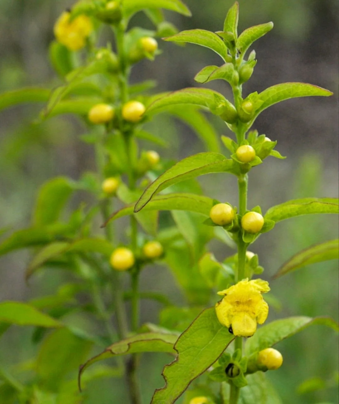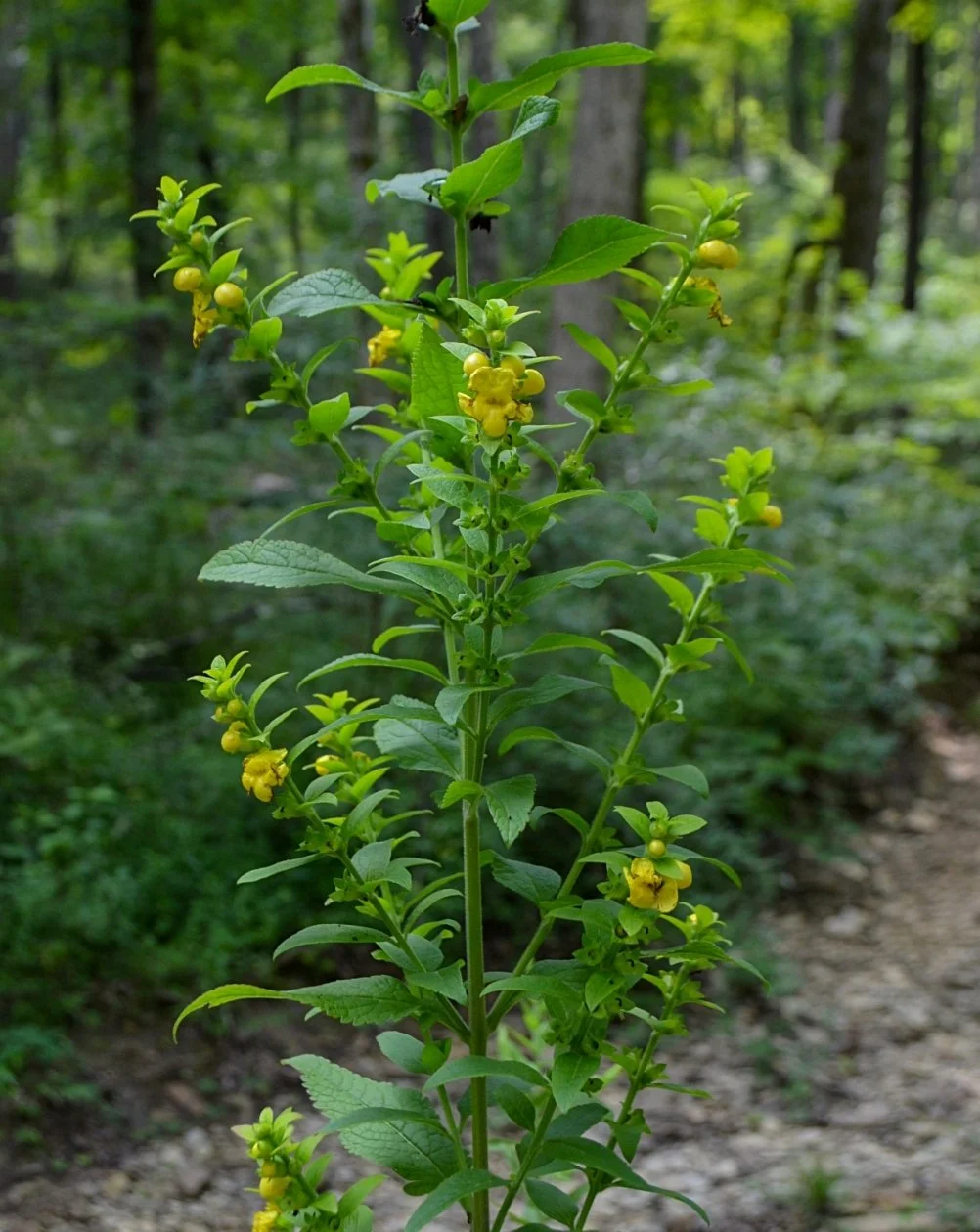 Mullein-foxglove can grow alone even though it partly depends on other plants. The plants preference is to partial sun, medium to dry soil conditions, and tolerates loamy, clay-loam, or rocky soil. This plant benefits from the proximity of oak trees. Its size is highly variable, and you can tell if it has connected to a host tree by its height: 2-3 feet tall without a host, up to 7 feet with one. It usually has a main stem that branches a little, with side stems that branch less. The stems are slightly hairy and range from green to reddish green. Leaves grow opposite each other and can be up to 12 inches long and 4 inches wide, getting smaller toward the top. Lower leaves have lobes and teeth, while upper leaves are long and smooth-edged. Leaf stalks get shorter going up, and top leaves often have no stalk. Most leaves have little to no hair.