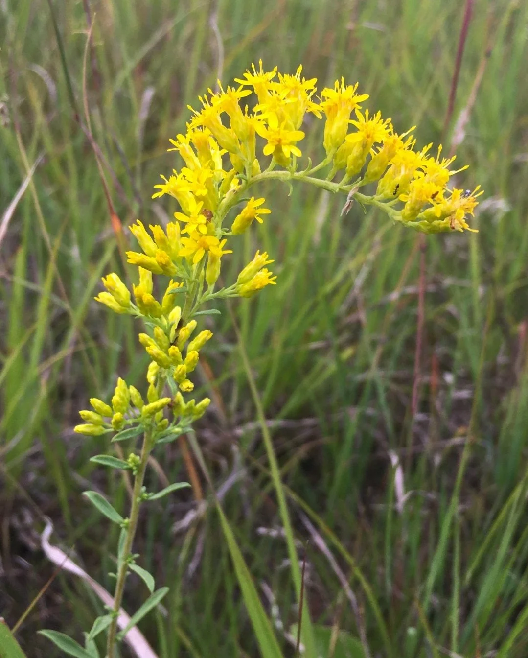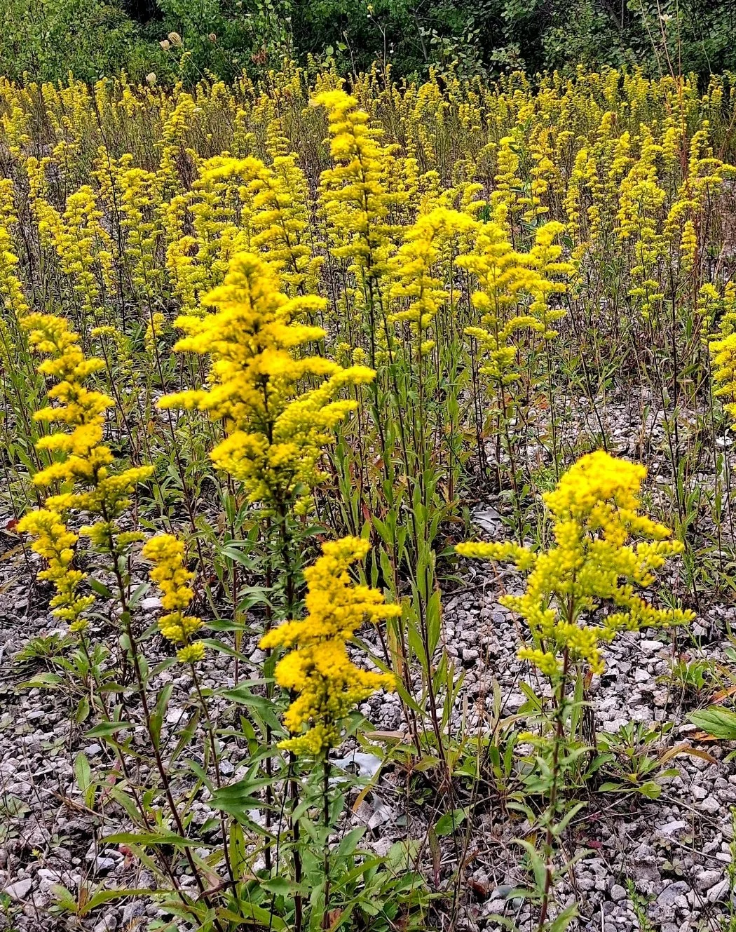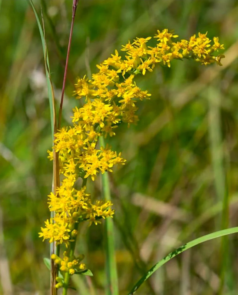 Old Field Goldenrod is a pioneer plant commonly found in diverse habitats such as forests, prairies, grasslands, old fields, and along roadsides. Its vibrant, bright yellow flowers are particularly attractive to a wide variety of pollinators, including bees, wasps, butterflies, moths, beetles, and flies, all of which play an essential role in its reproduction. Additionally, some insects, like Leaf-footed bugs and caterpillars, feed on its leaves, while many birds, especially the American goldfinch, consume its seeds throughout the entire year. This plant supports a rich ecosystem and contributes significantly to local biodiversity.