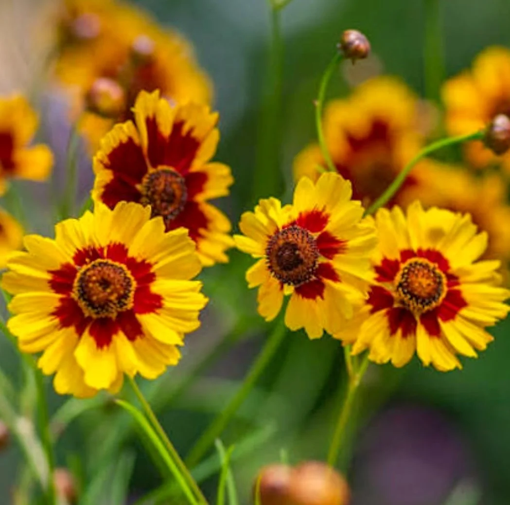 Coreopsis tinctoria is the scientific name for the native species more commonly known as commonly as Plains Coreopsis, Garden Tickseed, Golden Tickseed, or Calliopsis. Plains Coreopsis is a self-seeding annual forb commonly found in Canada (from Quebec to British Columbia), northeast Mexico (Coahuila, Nuevo León, Tamaulipas), and most of the United States, but most especially in the Great Plains and Southern States.